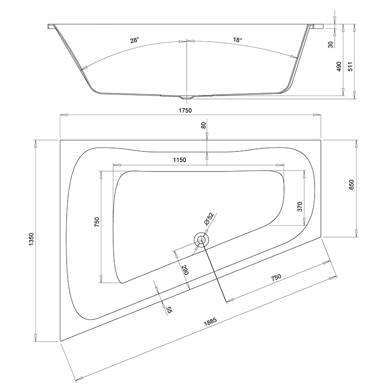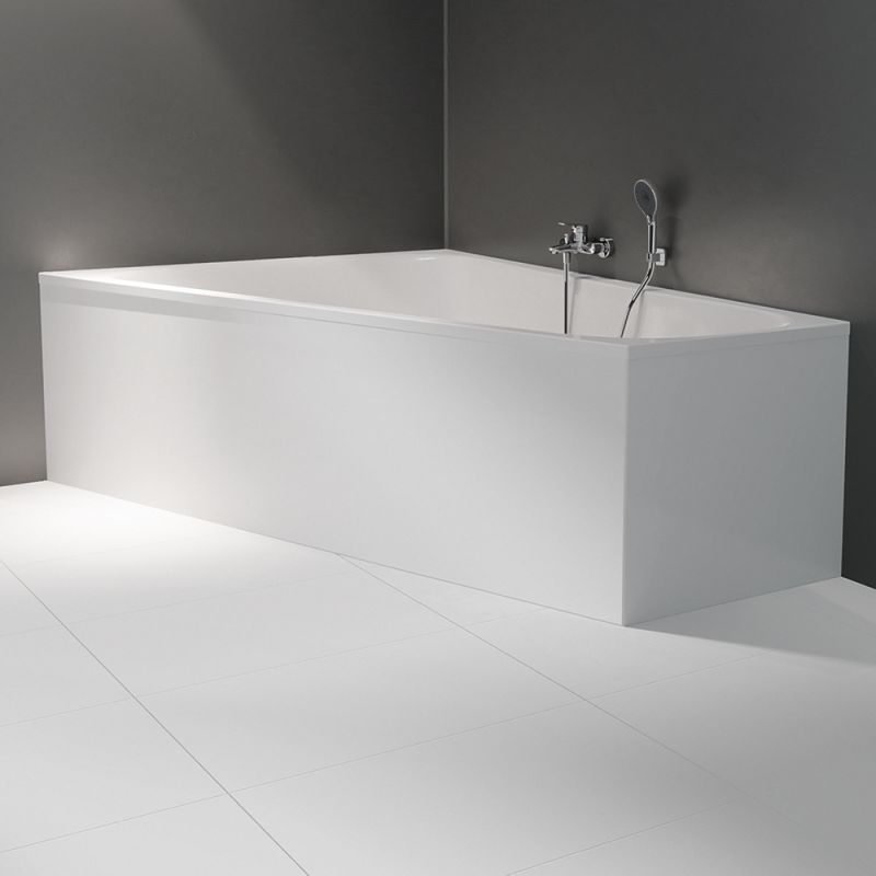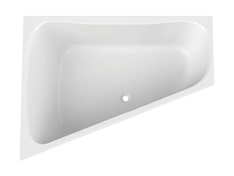 Trapez-Badewanne, links aus Acryl, in Sanitärqualität, aus Plattenmaterial tiefgezogen, rückseitige Glasfaser-/ Polyesterverstärkung und zusätzliche Stabilisierung im Bodenbereich, Ablauf mittig versetzt zur Überlaufbohrung hin, ohne Füße, ohne Ablaufprogramm, Ablauf Ø 52 mm, Innentiefe 49 cm, links, weiß